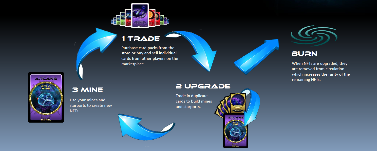 建设(第二阶段)--玩家可以通过交易复制物来建造矿场和星港。例如,他们将能够用金色的Arcana NFT在Arcana建造一个金矿,或者用钻石的Glaceus星舰卡在Glaceus建造一个钻石星港。被升级的NFT将被从流通中移除,增加剩余NFT的稀有性。