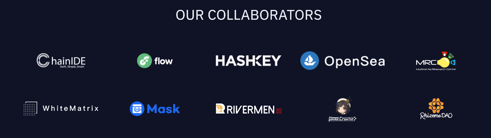 我们与ChainIDE、Flow、WhiteMatrix、Opensea、阿尔伯塔大学多媒体研究中心(MRC)、Mask、Rivermen和Game Creator建立了长期合作关系,这将使我们继续成为将沉浸式技术与有影响力的故事相结合的行业管家。我们将继续欢迎与其他区块链公司和该领域的专家接触的机会。