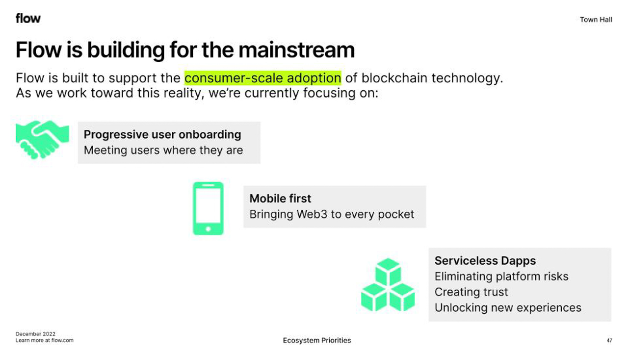 - 在采用方面不做任何妥协: 引入下一个10亿用户不仅仅是一个俗气的口号:这是Flow存在的全部原因,1700万个账户之后,我们已经在实现这一目标的路上。这需要新的范式,如支持每个账户的多个密钥,以实现联合签名和增强安全性,用户友好的钱包,以及快速和近乎于无操作的交易,使与区块链的互动成为用户的透明体验。