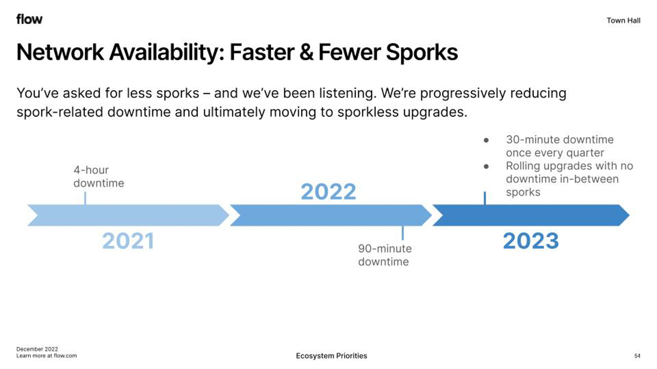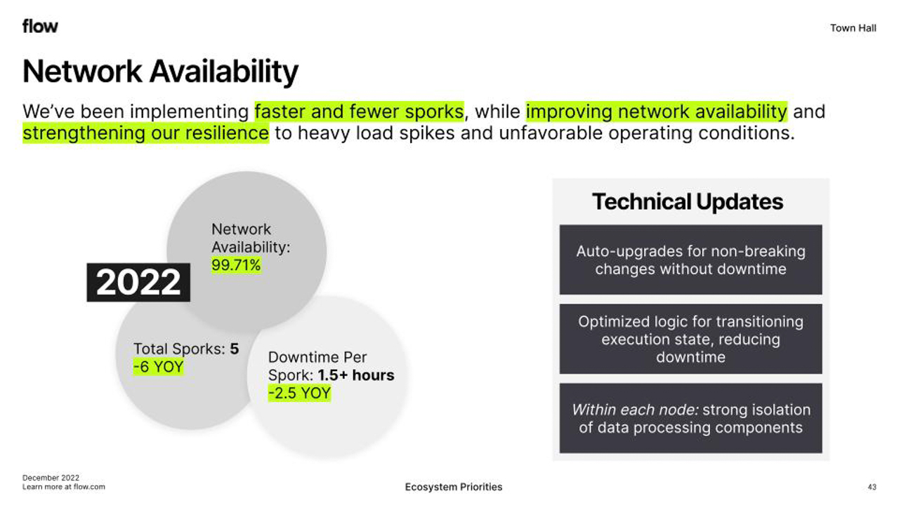 我们还对我们的事件管理流程进行了一些改进,并对节点运营商社区进行了调整,以更快地应对高严重性事件。因此,Flow网络现在对不利条件和负载高峰有很强的弹性,2022年99.71%的网络可用性清楚地表明了这一点。