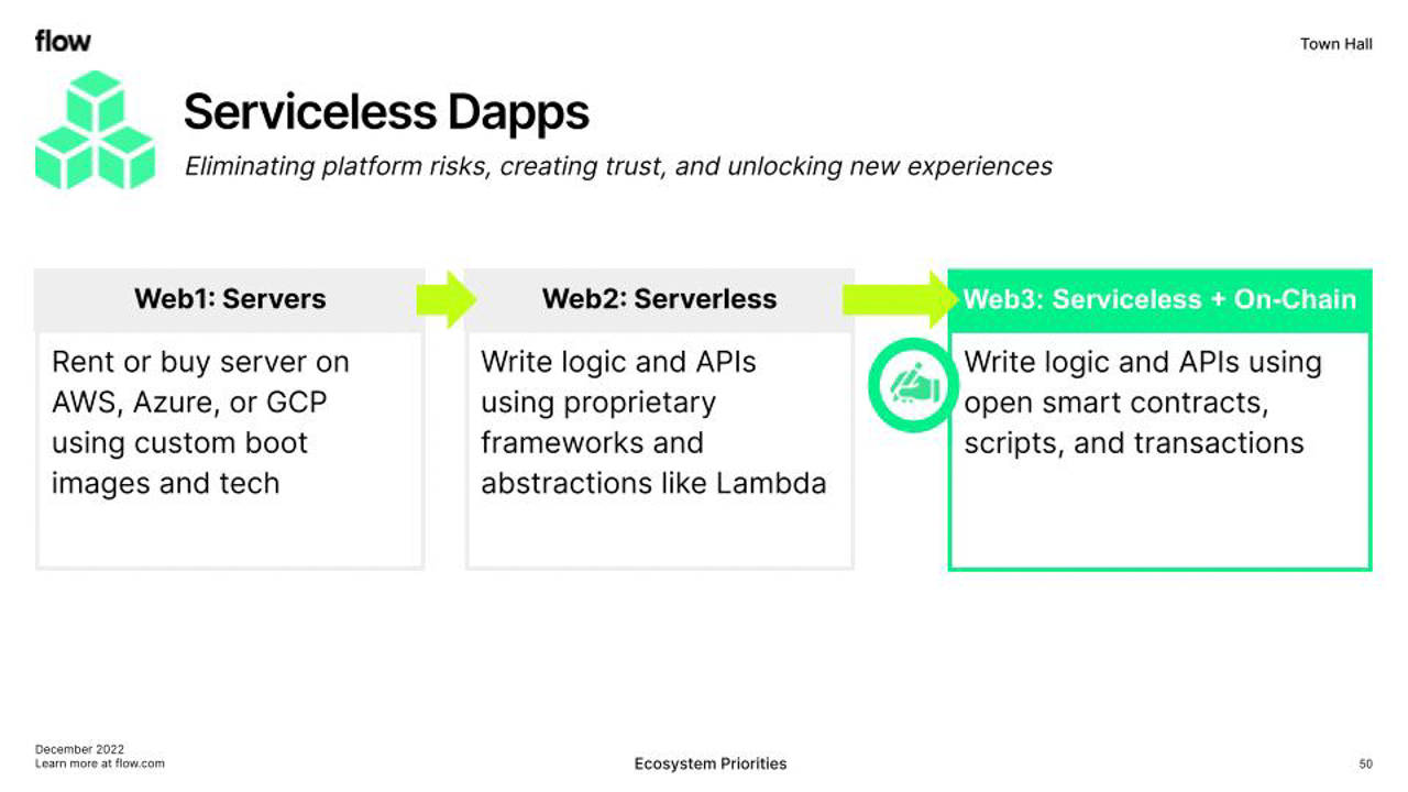 "无服务 "的方式(使用区块链)。 你把你的API服务和计算引擎写成一系列的智能合约、交易、脚本和客户端代码。智能合约和交易在区块链上运行,脚本在访问节点上运行,而客户端代码在浏览器/客户端应用程序中运行。AWS、GCP等都没有以任何方式参与。