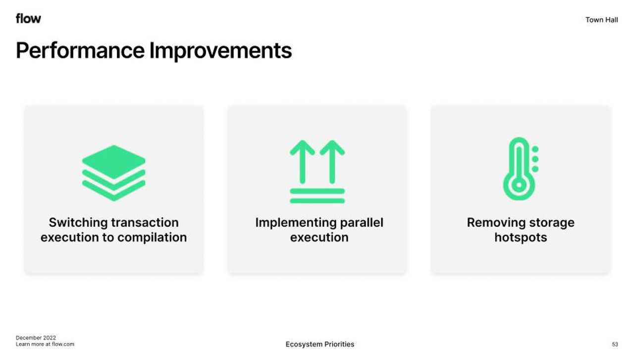 Flow的设计是随着需求而扩展,鉴于2022年的惊人增长,团队一直在努力实现性能上的第一次大飞跃。在过去的12个月里,Flow网络TPS吞吐量增长了10倍,从50TPS增长到500TPS,并有多项性能的全面提升。