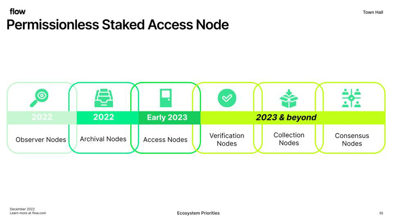 Flow的方法是不同的:不是每个节点都做所有的工作,Flow的节点是沿着交易管道专门化的。收集节点将工作分批进行,共识节点保证工作,执行节点进行工作,验证节点检查工作。访问节点是建设者可以访问网络的接口。在2022年,引入了2种额外的节点类型:无权限观察者节点和存档节点,以提高数据的可用性。