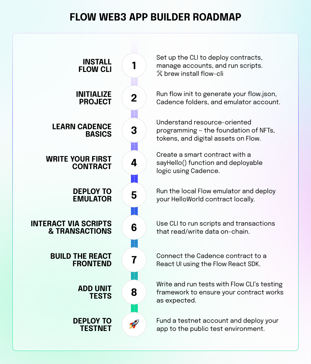 By following this guide, a Web3 developer can go from setting up the Flow CLI to writing, deploying, and interacting with their first Cadence smart contract, and even connecting it to a React frontend. Along the way, they’ve seen how Flow’s developer tools, emulator, and testing framework simplify the process of building real blockchain applications.